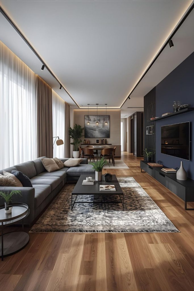 Navy accent walls in long rooms gain depth when paired with layered curtains. The wall anchors the space while the curtains add softness and dimension. Combining navy with neutral furniture or wood accents maintains balance, creating a stylish, curated environment that feels comfortable yet modern.