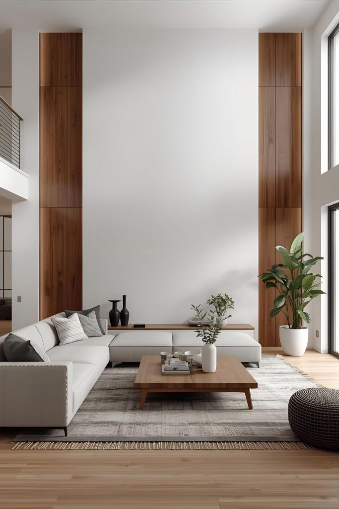 White walls with wood inserts around staircases offer a clean, contemporary look. Panels emphasize architecture without dominating, and wood adds warmth. This approach works in modern living rooms, creating cohesion with furniture and lighting, while visually linking the stair area to adjacent spaces.