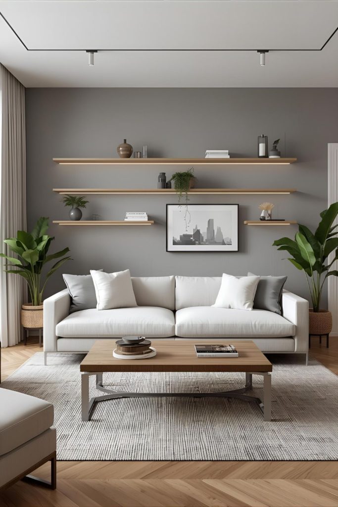 Light grey walls with floating shelves are a simple way to refresh living rooms. The neutral tone allows décor, plants, or art to stand out while maintaining a modern aesthetic. Shelves add functionality and dimension without cluttering the space, making it curated and inviting.
