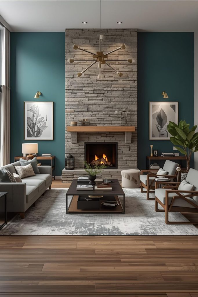 Teal walls behind fireplaces with stone surrounds create rich, cozy focal points. The color contrasts with neutral furnishings and highlights textures. Lighting enhances depth, and accessories on mantels or shelves complete the curated, modern look while supporting functional living spaces.