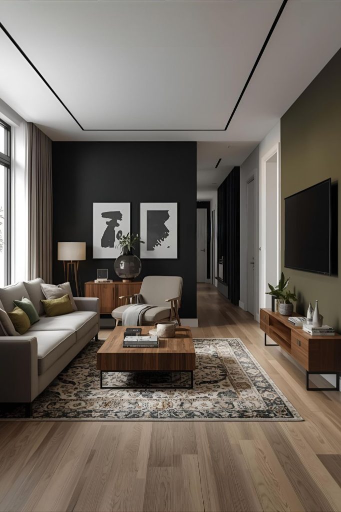 Black walls combined with olive green accents add sophistication to narrow living rooms. The darker color recedes visually, creating depth, while green highlights prevent heaviness. Using minimal décor and thoughtful furniture placement ensures the wall enhances flow, contributing to a curated and balanced layout.