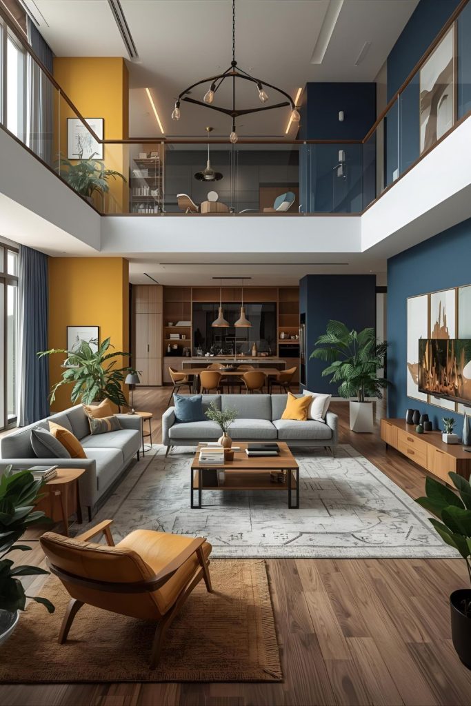 Combining yellow and blue accent walls energizes open living rooms, defining zones without separating spaces. Lighter furniture, rugs, and accessories balance vibrancy. The playful combination supports modern, curated interiors and helps connect living, dining, and kitchen areas visually.