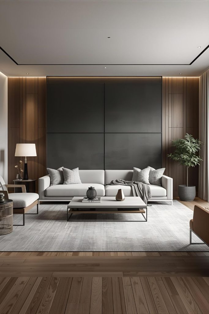 A dark grey wall behind the sofa anchors the seating area, creating a sleek, minimalist feel. Panels add subtle texture, and contrasting cushions or rugs prevent the wall from feeling flat. Lighting and décor placement reinforce a curated, modern aesthetic without overpowering the room.