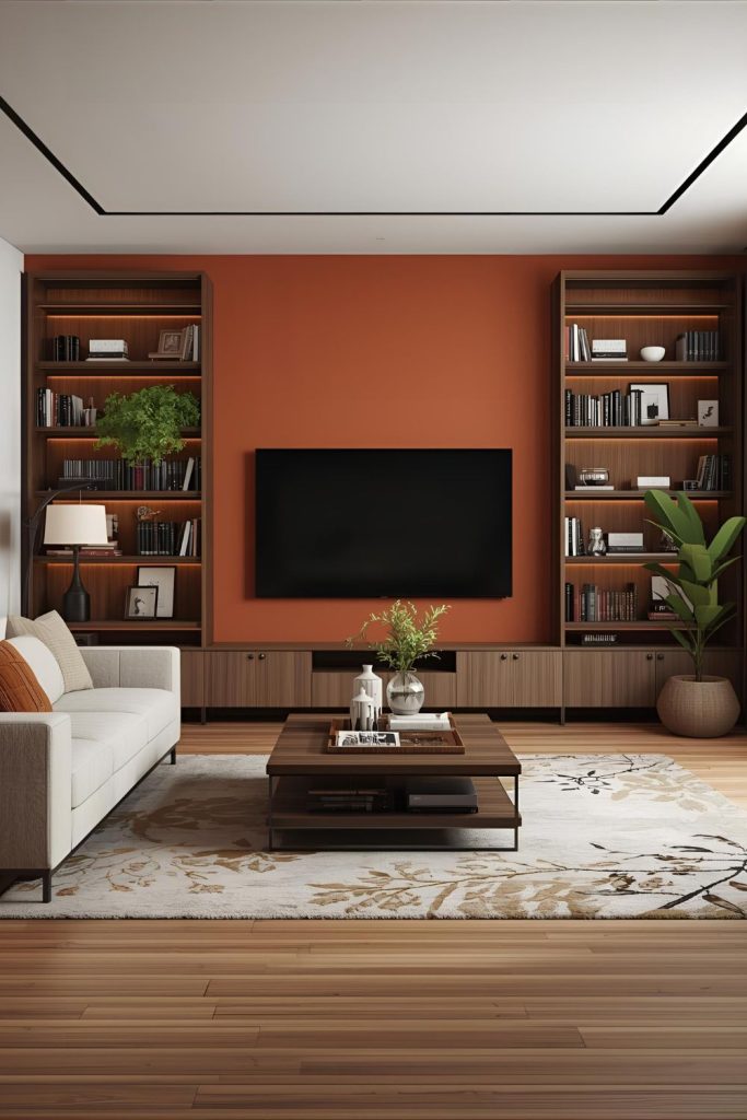 Burnt orange accent walls with built-in shelving combine warmth, color, and functionality. The shelves provide display space while the orange adds vibrancy, particularly against neutral sofas or rugs. Proper lighting ensures balance, making the wall a curated focal point in modern living rooms.