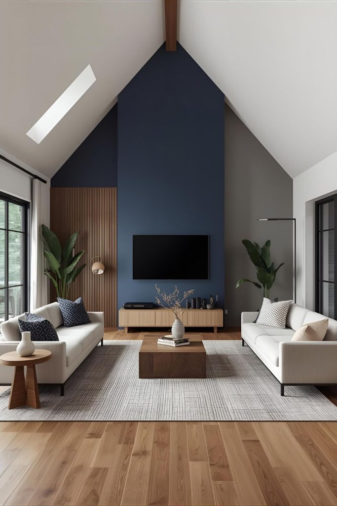 Navy walls in vaulted ceilings add drama while emphasizing vertical space. Contrasting furniture or wood accents balances the dark tone. The wall acts as a bold statement that enhances architectural features, creating a modern and curated living environment with visual interest and depth.