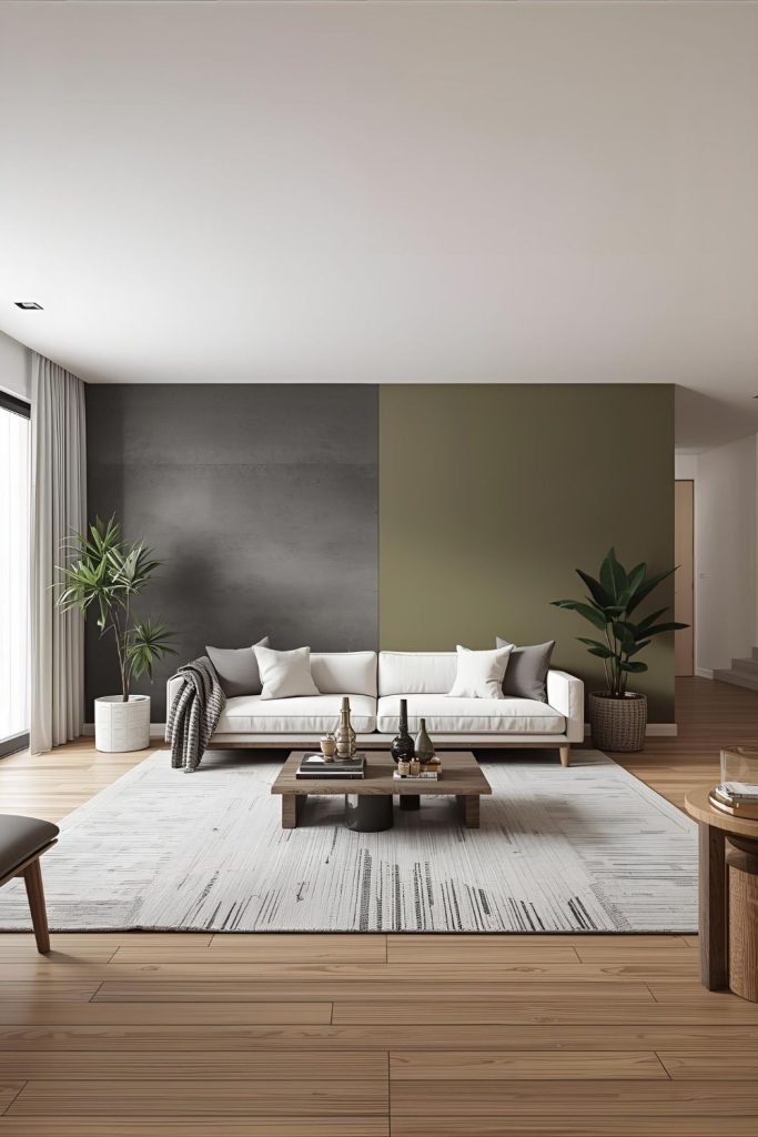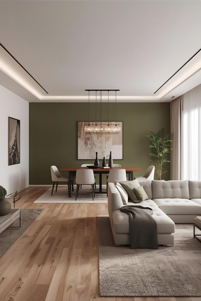 Grey and olive accent walls create a balanced, modern look in open living rooms. Pairing these colors with a white sofa ensures the space feels fresh and airy while maintaining visual interest. Olive adds a touch of warmth and earthiness, while grey offers neutrality and sophistication. Accessories like cushions, rugs, and art pieces can complement this palette, and proper lighting ensures colors appear vibrant and cohesive throughout the day. This approach works well in open layouts, connecting living, dining, and kitchen areas seamlessly.