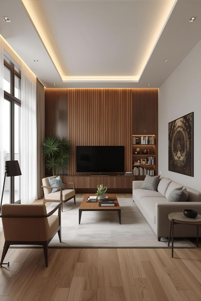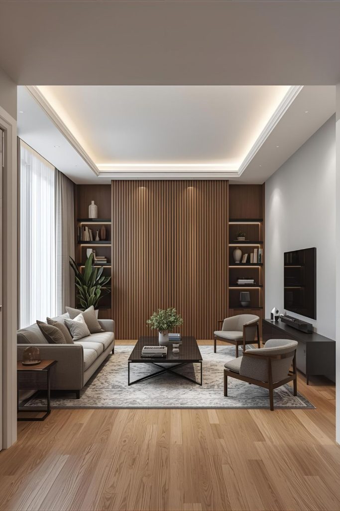 In narrow living rooms, half-wall wood paneling adds warmth and visual interest without overwhelming the space. Using horizontal panels can make the room feel wider, while vertical panels emphasize height. This approach provides a subtle yet effective accent wall in living rooms, creating separation between seating areas or adjacent spaces. Light wood tones paired with neutral furniture help maintain brightness, and the paneling can serve as a backdrop for art, lighting, or floating shelves. The half-wall concept balances practicality and style, giving narrow rooms a curated and inviting feel.