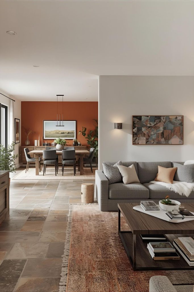 A burnt orange wall behind a dining area adds warmth and energy, perfect for modern farmhouse interiors. DIY techniques such as painting with textured rollers or layering shades can create depth. This accent wall complements wooden furniture, stone flooring, and rustic lighting. It transforms the dining area into a focal point while maintaining cohesion with the living space, especially when paired with neutral walls and muted décor. Burnt orange works well with olive, navy, or grey accents, balancing vibrancy with a curated, lived-in aesthetic.