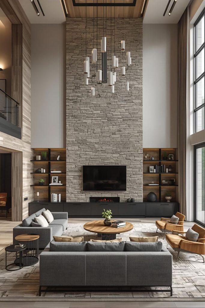 Stone accent walls in high-ceilinged living rooms introduce natural texture and dimension. Adding black shelves provides contrast and functionality, allowing decorative or personal items to stand out. This combination enhances modern, curated aesthetics by blending organic and sleek elements. Proper lighting, such as recessed ceiling lights or adjustable sconces, accentuates stone textures, highlighting depth and creating dynamic visual interest. The wall becomes a dramatic centerpiece without overwhelming the rest of the living room décor.