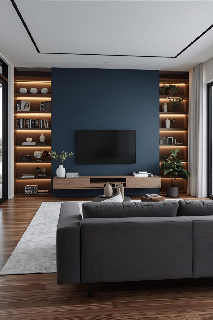 Navy Accent Wall Design With Floating TV Mount for a Sleek Home Setup