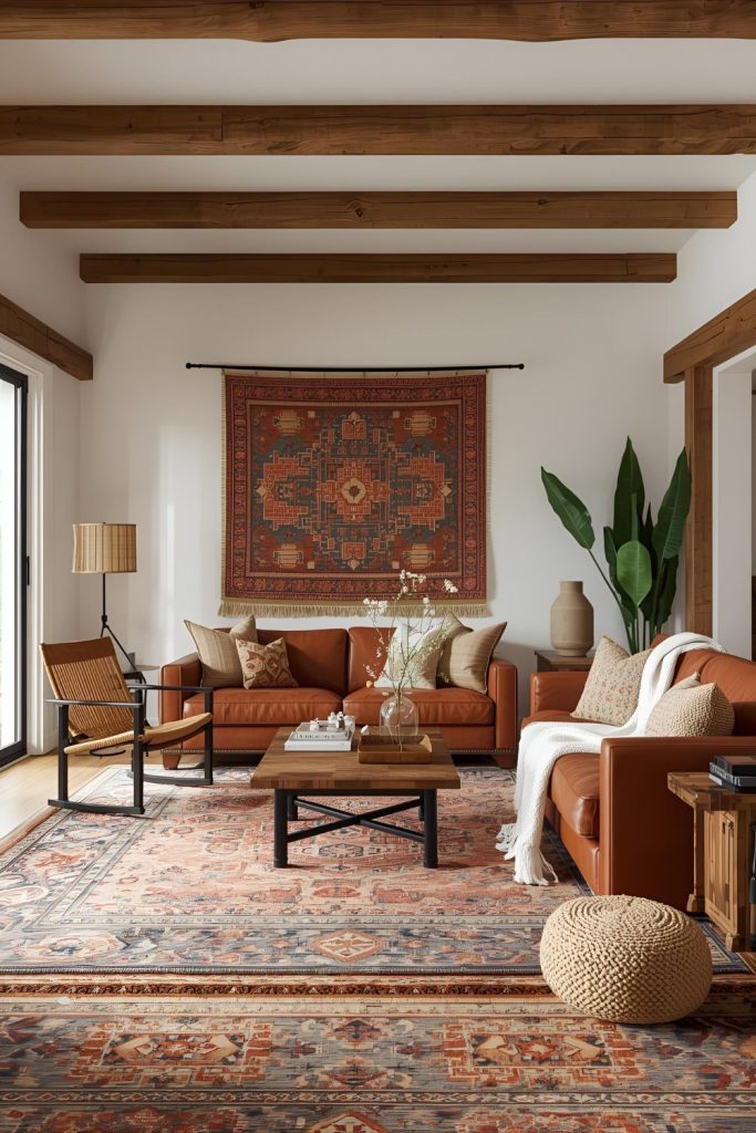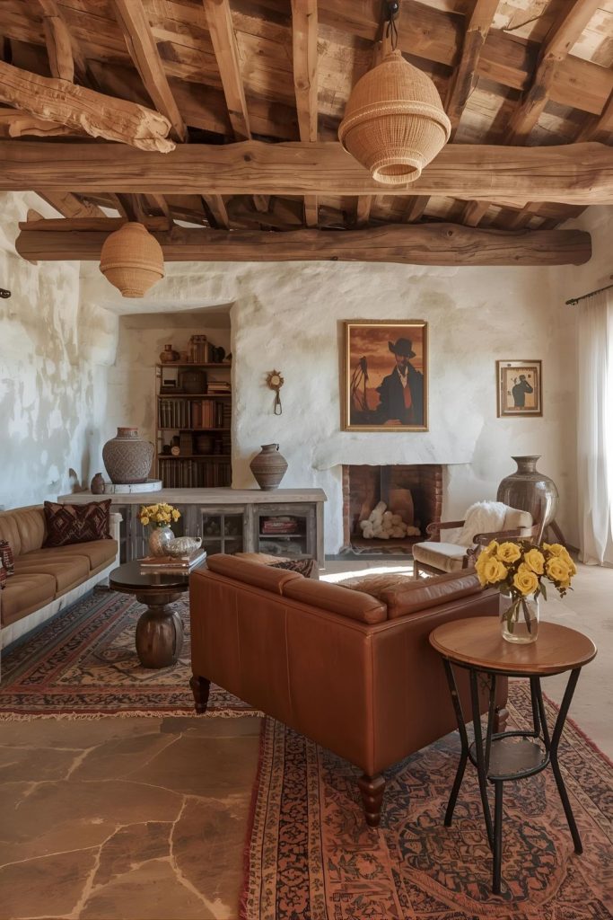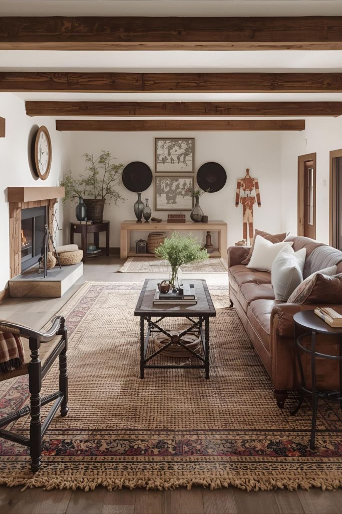 Jute and wool work well together because one is more coarse and one is softer. Layering them creates comfort in a western living room ranch style. Jute rugs ground the room while wool blankets bring warmth. When you place a wool throw across your leather sofa it softens the look instantly. Jute baskets also help with storage while keeping the room natural. These textures help the room breathe. You can mix different sizes, colors and patterns as long as they stay in earth toned colors. This approach keeps your room warm through all seasons.