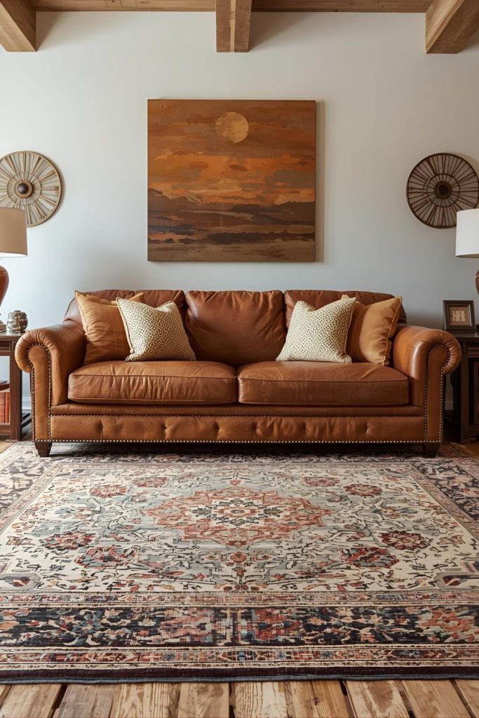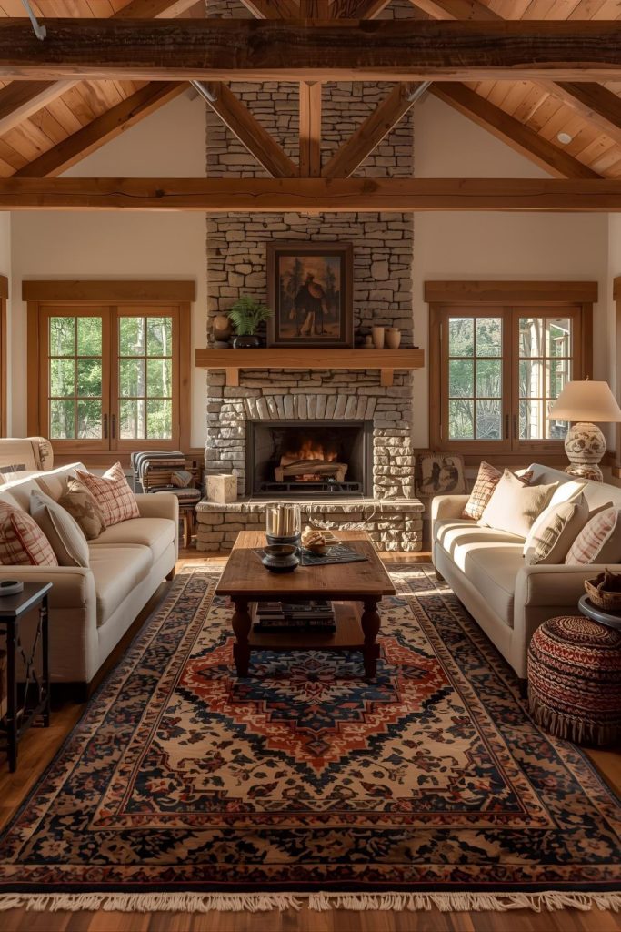 Wool rugs help separate the room into zones. This is useful in wider rooms. Patterns in muted colors work well for a western living room ranch style. Wool feels soft underfoot and matches natural textures like leather and jute. Place a rug under your main seating area to bring everything together. The rug adds warmth and encourages people to gather in the center of the room.
