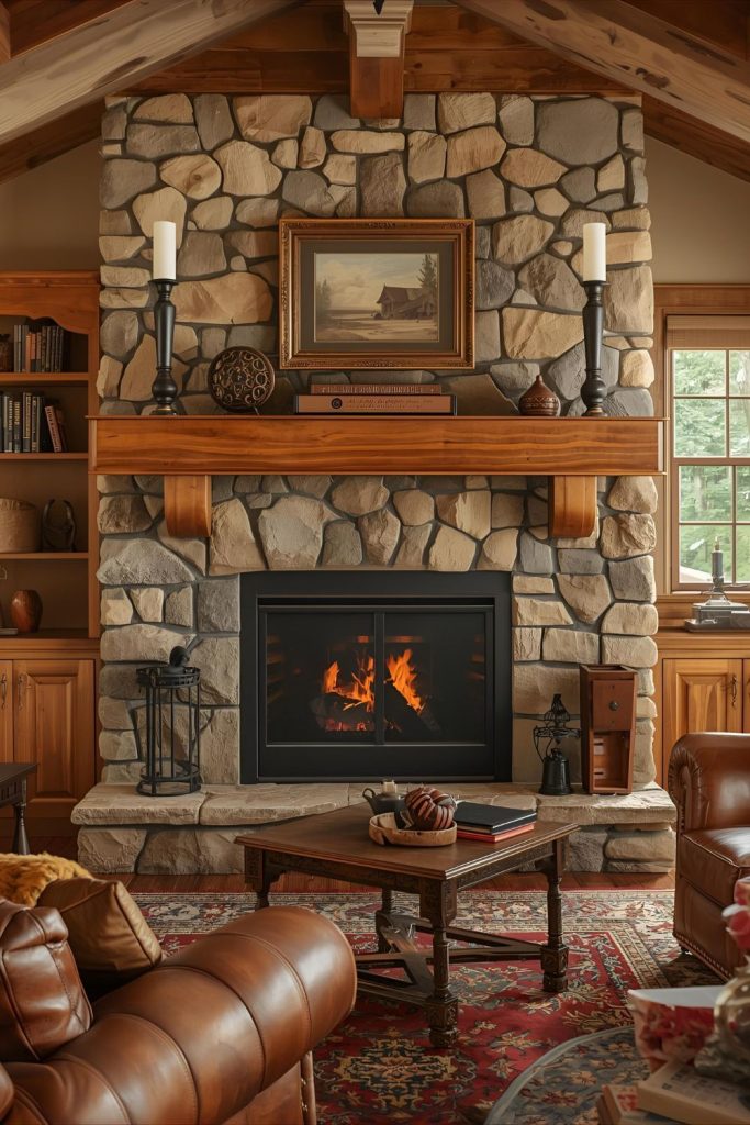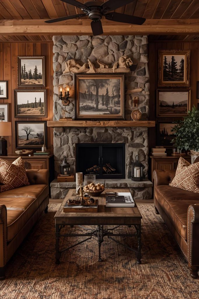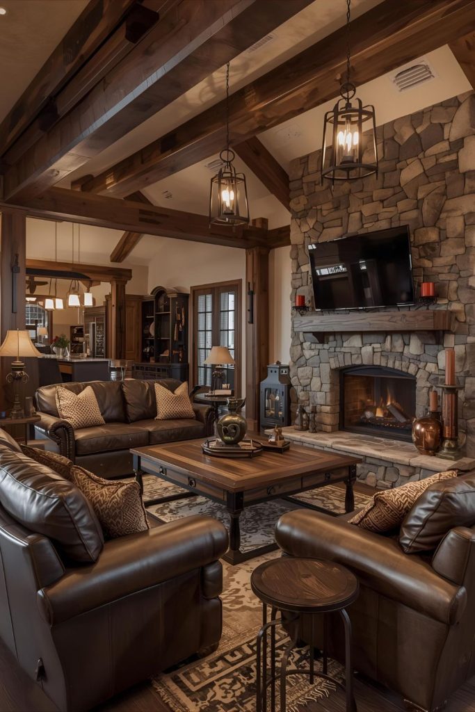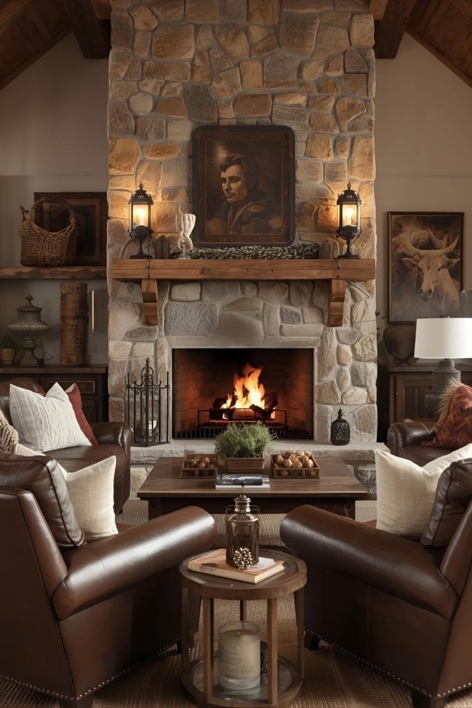 Stone gives your living room a grounded feeling. The uneven textures and warm colors help your western living room ranch style feel steady. A stone hearth becomes the heart of the room during cooler evenings. The rough stone contrasts with smooth leather and warm wood. You can use smaller stones for a patchwork look or larger stones for a more calm appearance. Pair the stone hearth with soft lighting so it glows at night. This adds warmth even when the fire is not lit.