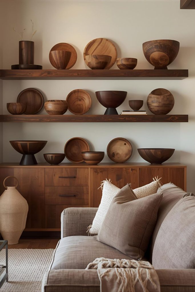 Wood bowls and sculptural items add natural beauty. Their shapes and grain patterns bring interest to a western living room ranch style. Place them on shelves or a table. Their warm tones blend with beams and furniture. Even small imperfections add a personal touch. You can find pieces made from olive wood, maple, or walnut. They work well with pottery, plants, and books. This creates a calm mood in the room.