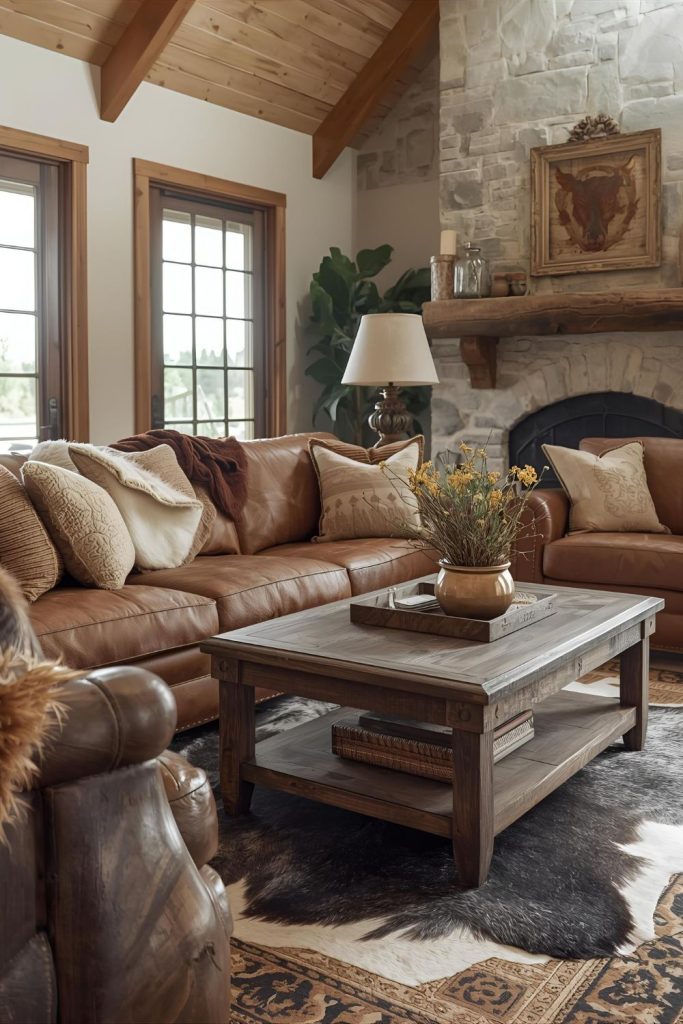 Cowhide and shearling throws add comfort and color. They pair well with leather sofas and wooden floors in a western living room ranch style. A cowhide throw makes the room feel rustic without overpowering anything. A shearling throw adds softness that feels cozy in cooler months. You can place them on chairs, drape them over the back of a sofa, or lay them near the fireplace. These rugs and throws help the room feel layered and warm.