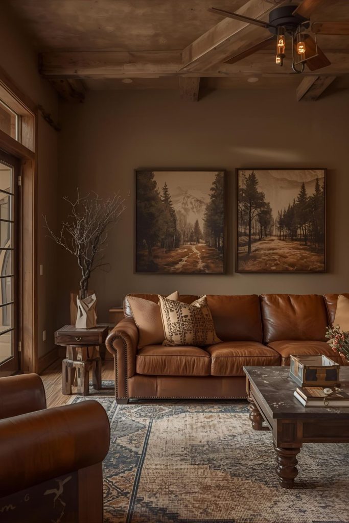 A saddle tan sofa creates a friendly and calm atmosphere. The slightly worn finish makes the room feel lived in. In a western living room ranch style this color blends with wood floors, stone accents, and wool rugs. The sofa becomes the main seating spot. When guests walk in they feel drawn to it. Saddle tan also blends with both light and dark decor which makes it flexible. Add a few neutral pillows or wool blankets to soften the look. Over the years the leather will age into a deeper tone which only improves the style.