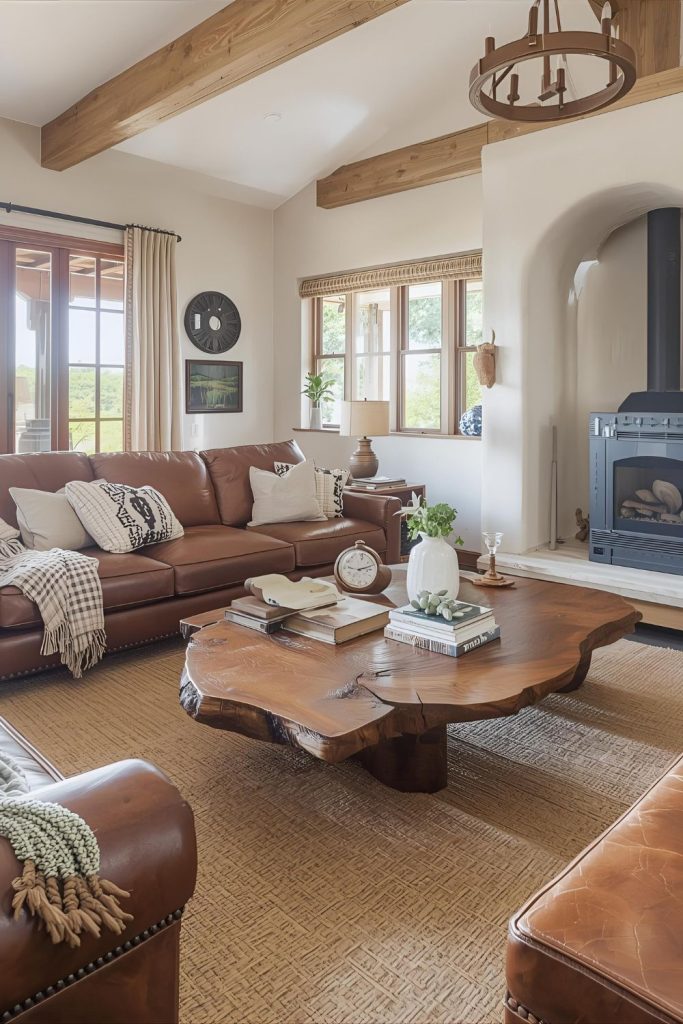 A live edge table highlights the natural curves of wood. It brings character to a western living room ranch style because it shows how the tree once grew. The table becomes the heart of your seating area. It pairs well with leather sofas, stone accents, and woven rugs. You can choose a bold thick slab or a lighter one for a softer look. Add a few bowls, books or plants to keep the table interesting but not busy.