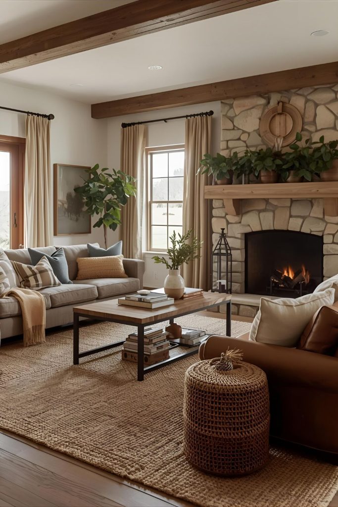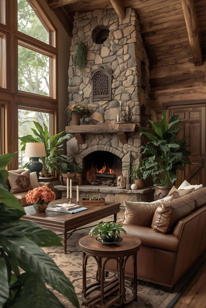 Stone is also important. Rough stone around a fireplace makes the living room feel honest and grounded. It makes the room feel like a place where family gathers in the evening. Clay materials, terracotta accents, and ceramic pottery bring more warmth. They add color without being loud.