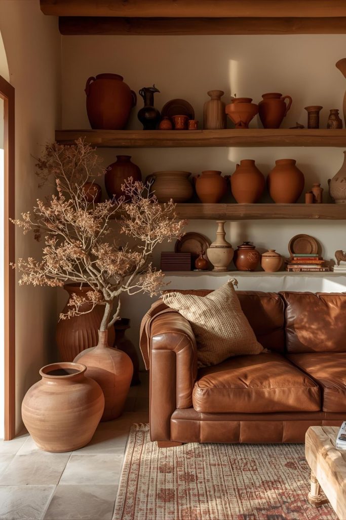 Clay pieces add a natural and handmade quality to the room. Terracotta pots and bowls bring small touches of warm color. In a western living room ranch style they fit well with wood shelves and leather seating. Place them in groups of two or three to avoid clutter. Their warm tones help fill empty corners and complement earth colored rugs.
