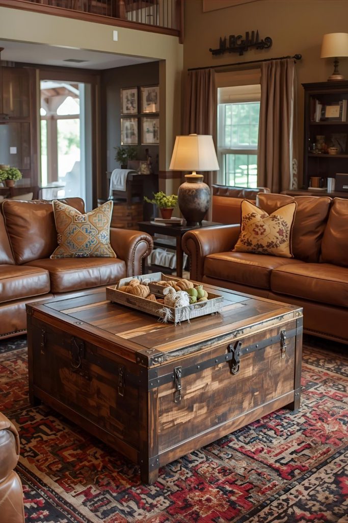 A trunk gives you storage while adding charm. It works well as a coffee table or placed against a wall. In a western living room ranch style a wooden trunk with metal handles looks right at home. The worn finish tells its own story. You can use it to hold blankets, games, or seasonal decor. It makes the room feel warm and useful at the same time.