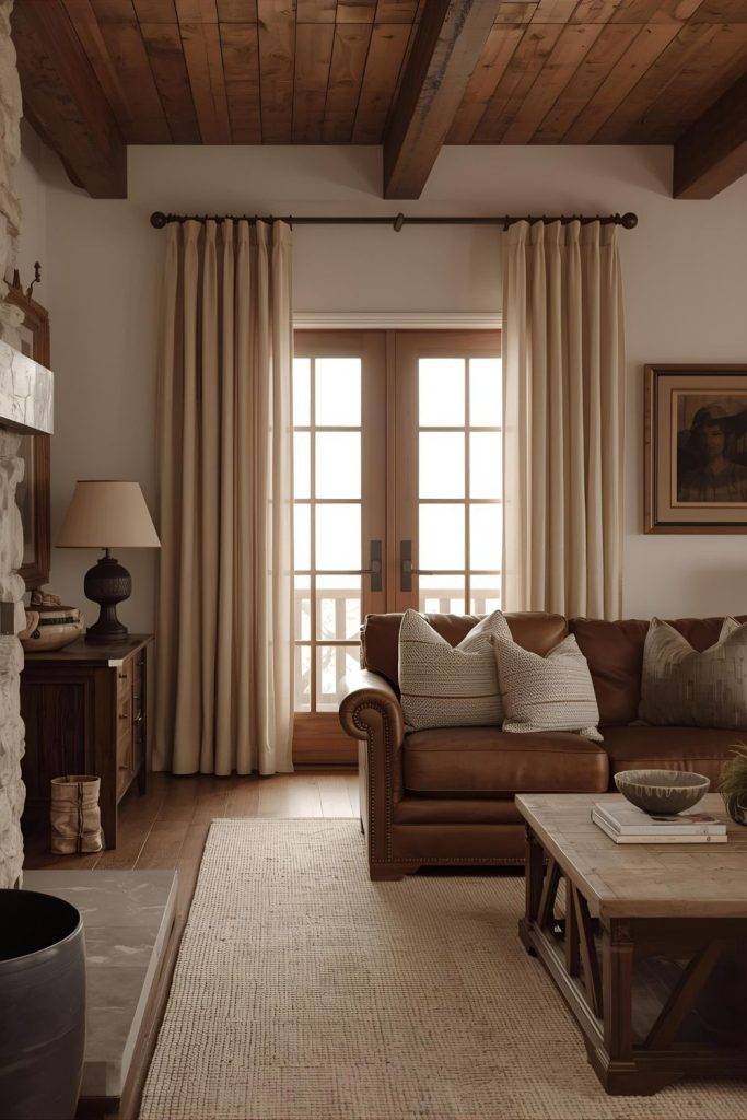 Linen curtains move gently with air flow and soften any room. When you hang them from heavy wood rods they add warmth and height. This works well in a western living room ranch style because the combination looks calm and inviting. Pick neutral tones so the curtains do not overpower other materials. The softness of linen next to wood beams and leather seating keeps the room balanced.