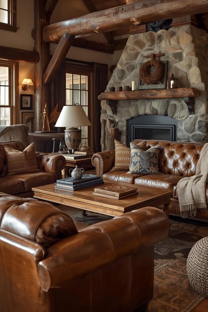 Leather seating with hand stitched details brings confidence to a western living room ranch style. Hand stitching adds a small personal touch that highlights craftsmanship. The leather softens over time and becomes more inviting. When you pair this seating with wood tables, warm rugs, and a stone fireplace the room feels unified. People often gather around leather seating because it looks comfortable even before they sit down. This keeps your room welcoming. Even if the leather gets small marks over time it just builds more character which is one of the reasons this style stays appealing.
