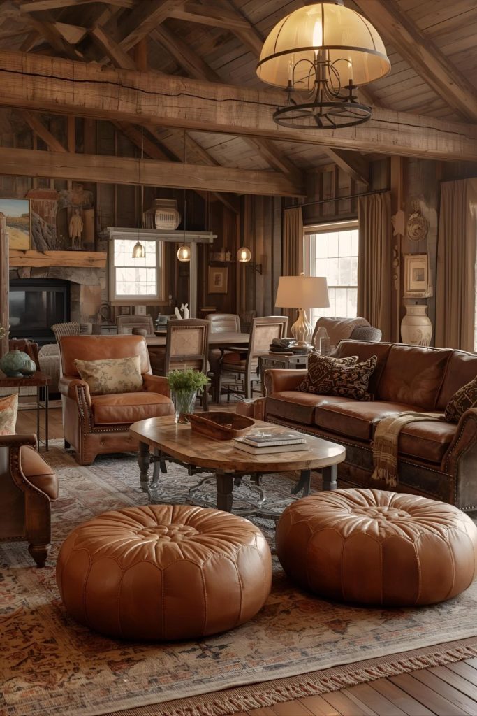 Leather poufs give you extra seating without taking up much space. Their soft shapes and natural tones support a western living room ranch style. You can place them near the coffee table or on each side of the fireplace. They blend well with leather furniture and wood floors. Their flexibility makes them useful for guests or for resting your feet. They help the room feel relaxed and welcoming.