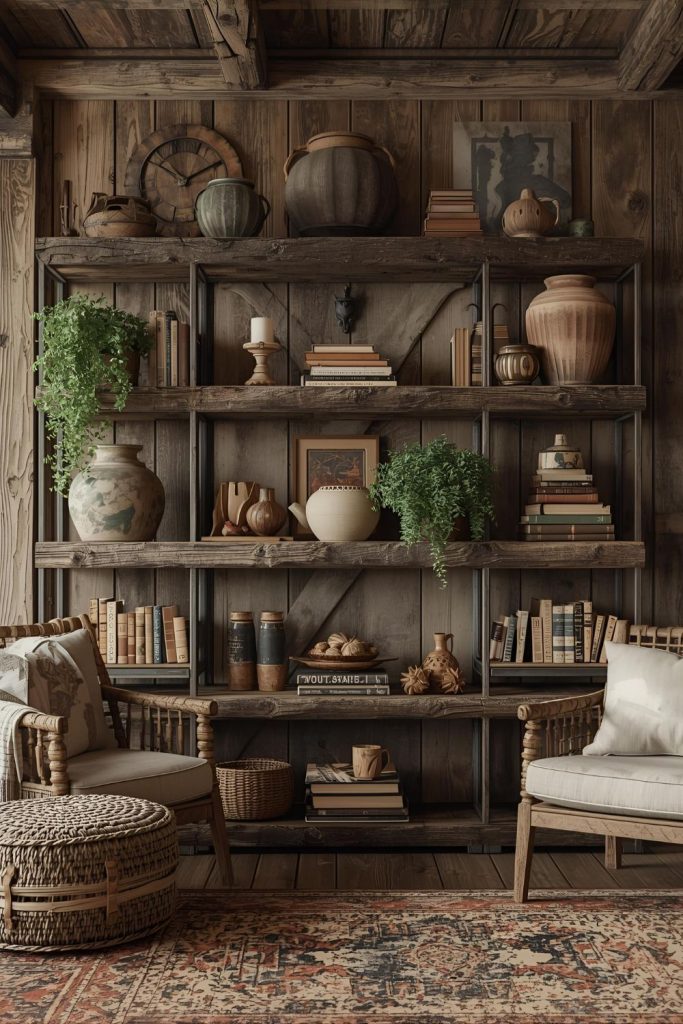 Weathered wood shelves give you a place to display thoughtful pieces. They blend with beams, furniture, and floors in a western living room ranch style. Add books, pottery, framed photos, small plants, and small handmade decor. The shelves fill empty walls and bring personality to the room. The wood grain adds warmth that supports the design.