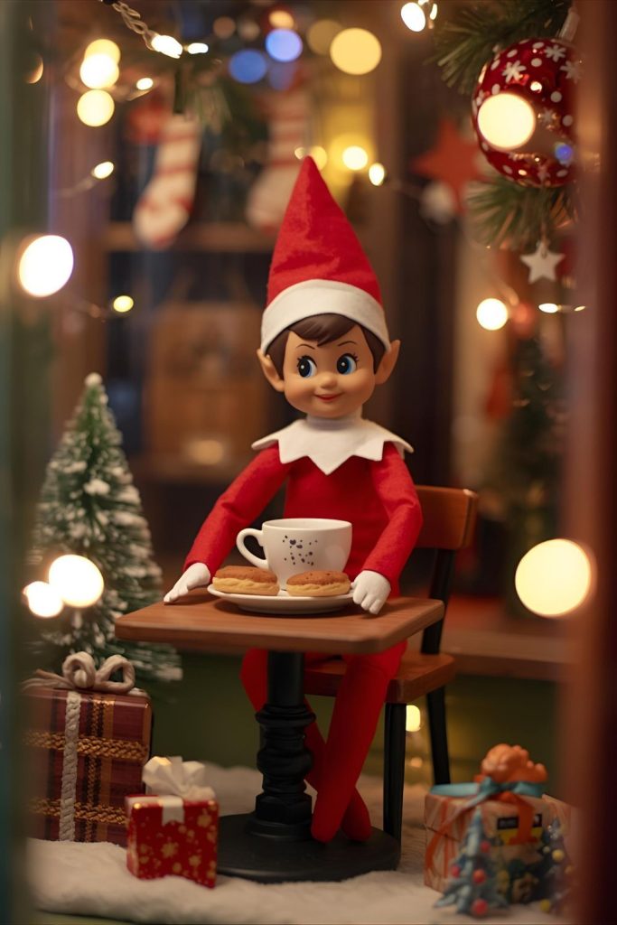 - Pose elf on a table with a small sign saying “Morning Mocha Elf Time.”