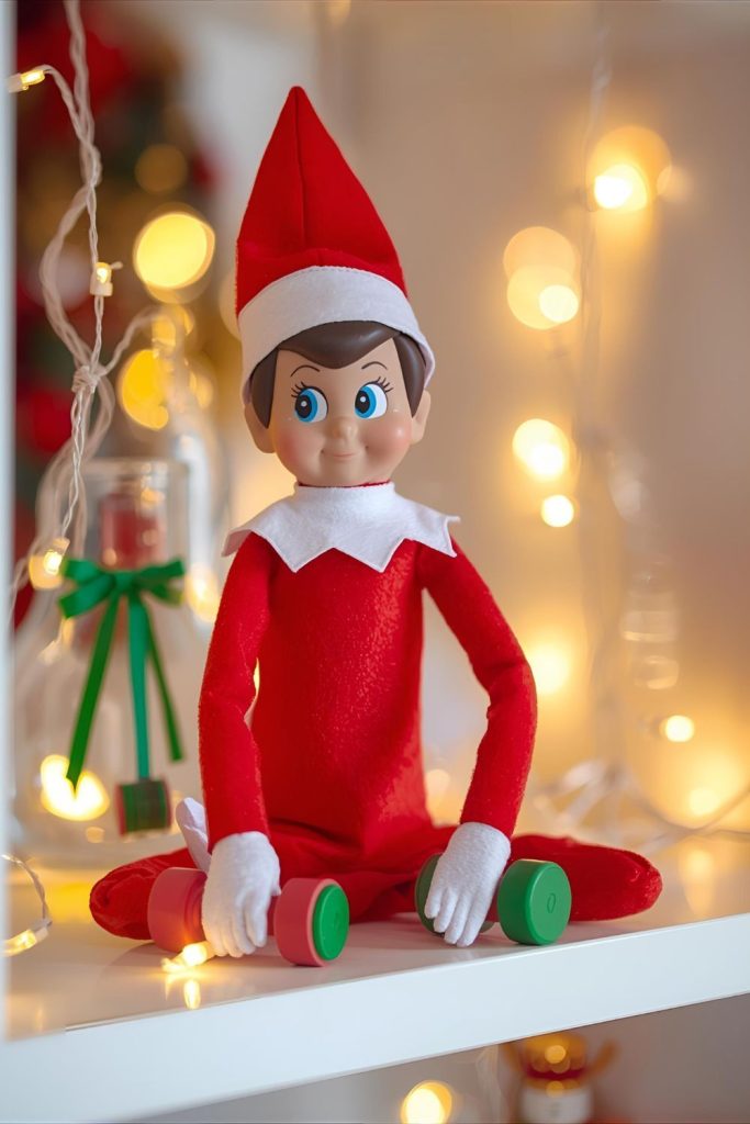 Set elf “working out” with mini dumbbells or yoga pose.