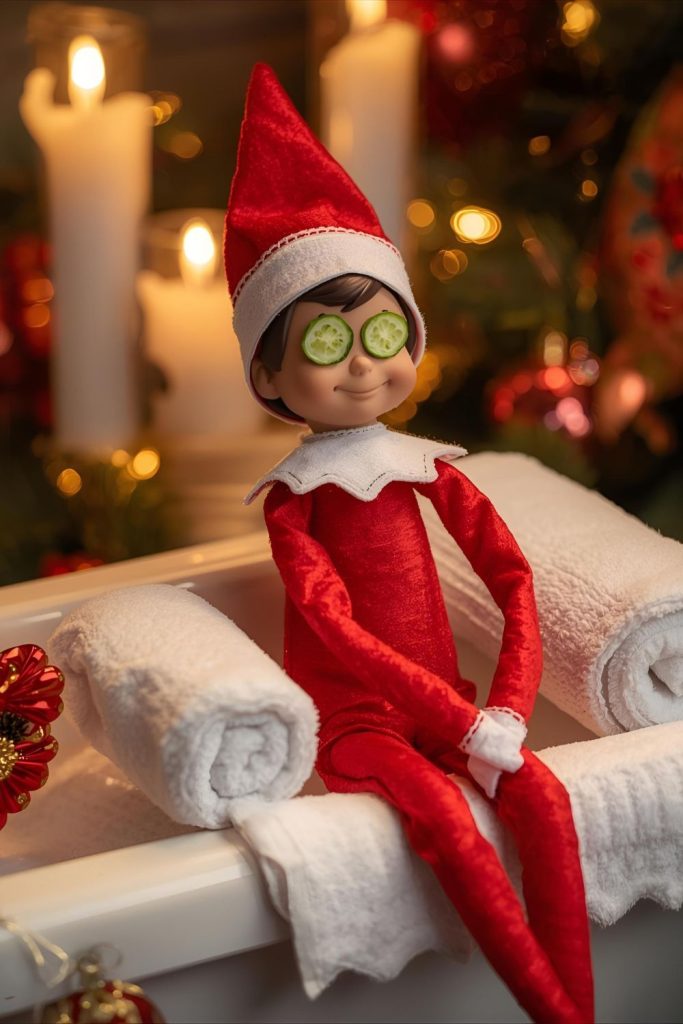 - Place elf on a cozy spot with a mini bathrobe vibe.