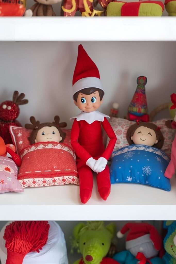 Arrange the elf with other toys for a pretend sleepover.