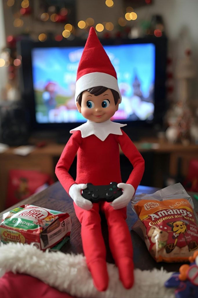 Set elf with controller and mini snacks as if playing a game nonstop.