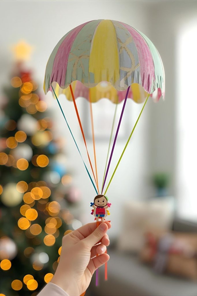 Turn a paper plate into a colorful parachute for small toys. You’ll need paper plates, string, small plastic figures or toys, hole punch, and markers or paint. Decorate the plate with holiday colors or patterns. Punch holes evenly around the edges and tie strings to each hole. Gather the strings together and tie to the toy. When kids throw the parachute up, the toy floats down slowly. This diy christmas gift for kids combines crafting and play, giving them something to throw and catch inside or outside. It’s a cheerful, light gift that’s easy to make in minutes.