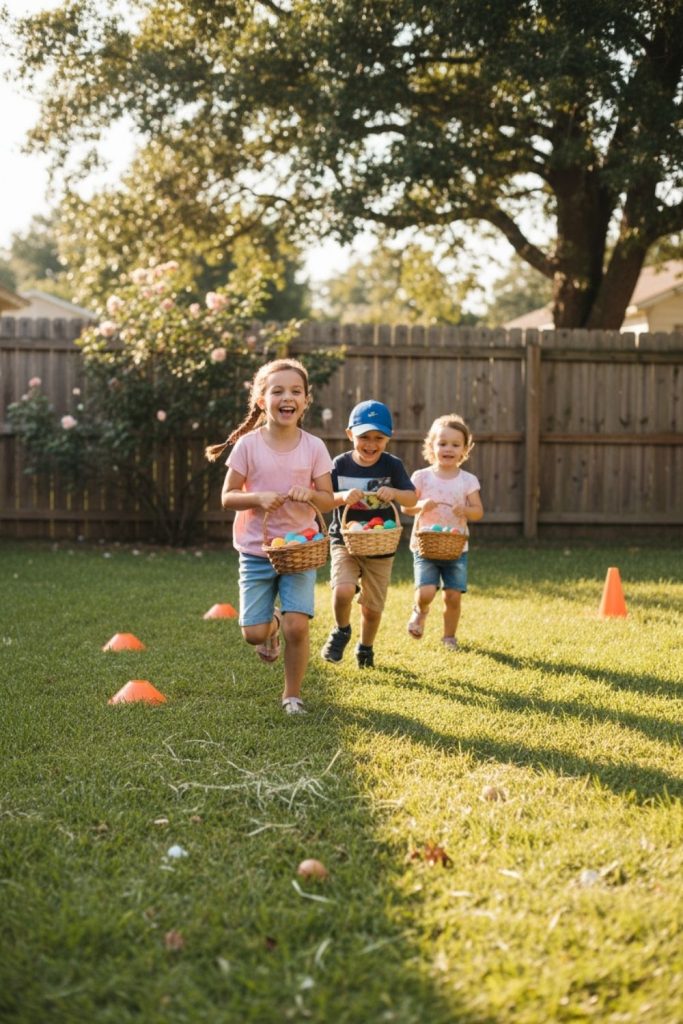 An outdoor relay with baskets adds teamwork to classic relay games. Children carry items from one point to another in baskets, passing them to teammates. You can make it a timed race or just encourage cooperation. This activity promotes coordination, collaboration, and social skills. Setting up simple markers or cones creates clear paths, and you can vary the difficulty depending on age. Outdoor relay games are effective Easter activities for kids because they combine movement, teamwork, and a playful competitive edge that keeps kids excited.