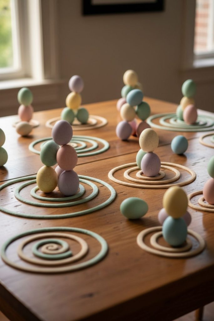 Fine motor egg stacking challenges children to stack plastic eggs to form towers or patterns. It requires focus, dexterity, and patience, and can be played solo or competitively. You can vary the sizes of eggs for added difficulty. This quiet but engaging activity complements more energetic games. Fine motor egg stacking is an accessible Easter activity for kids that develops hand-eye coordination and keeps them entertained.
