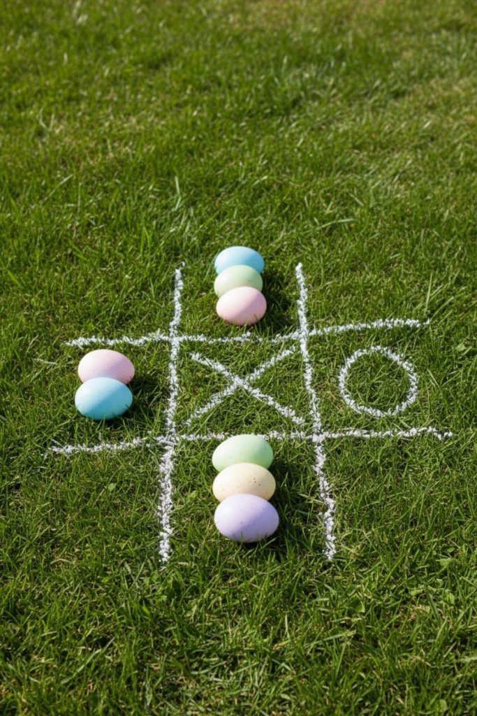 Outdoor Easter tic-tac-toe is created using chalk, markers, or mats. Children use eggs or small objects to place in the grid, practicing strategy and problem-solving. Teams can compete or children can play individually. This game combines thinking with tactile play. Outdoor Easter tic-tac-toe is a simple but fun Easter activity for kids that mixes skill and seasonal flair.