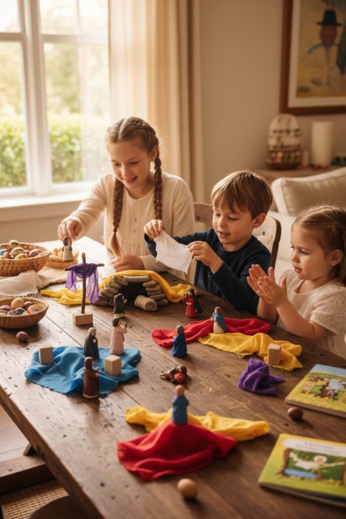 Role playing the Easter story can be both fun and educational. Using simple props like cloths, baskets, or small figurines, children can act out scenes from the Easter story. This encourages creativity and helps kids understand the meaning behind the holiday. Assigning different characters to different children allows for group participation, and older kids can help guide younger ones through the story. Even if props are minimal, kids often fill in the details themselves, making it an interactive experience. Easter story role play is an Easter activity for kids that combines learning with imaginative play, ensuring both fun and reflection.