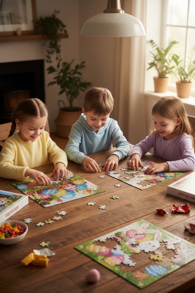 Setting up an Easter puzzle station is perfect for indoor play. Provide different puzzles ranging from simple shapes to more complex themed images for older children. Kids can work individually or collaboratively, developing problem-solving skills and concentration. This activity is quiet, making it a good option for calming down after more active games. Adding small rewards or stickers for completing a puzzle can increase motivation. Puzzles can be rotated during the day to keep children interested. Easter puzzle stations are one of those Easter activities for kids that blend fun with learning seamlessly.