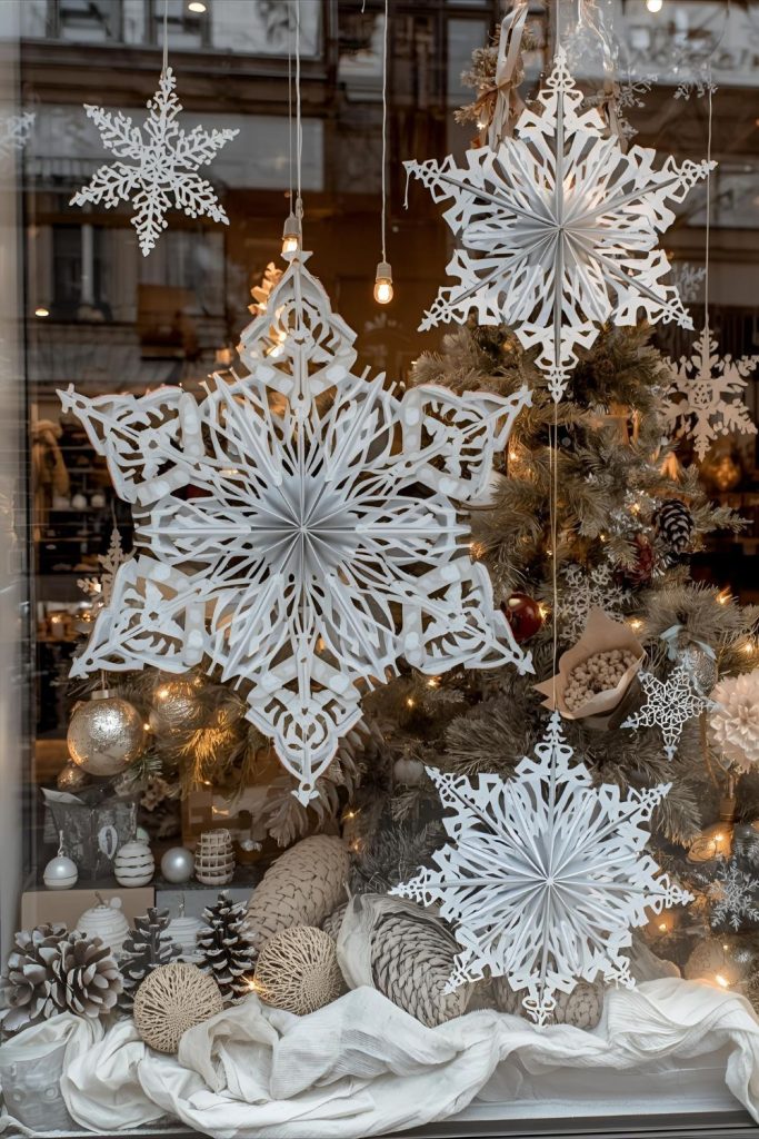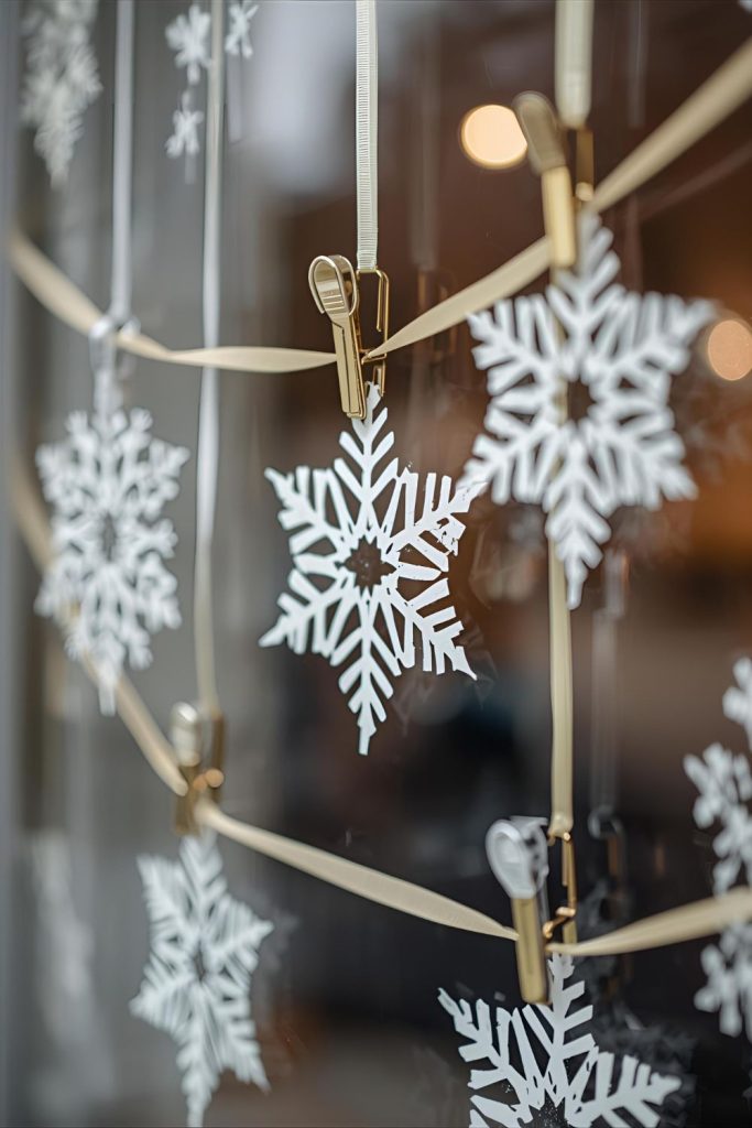 Decorate with delicate paper snowflakes layered across the window for a magical, snowy effect.