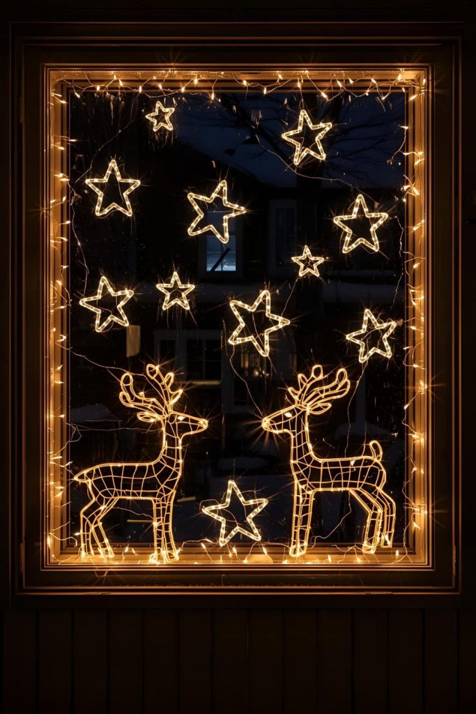 Lights don’t have to just outline your window frame. Try shaping them into simple, recognizable holiday forms like stars, reindeer, or candy canes. Use flexible wire lights or bendable LED ropes to create these shapes, then attach them carefully with clear hooks or clips.