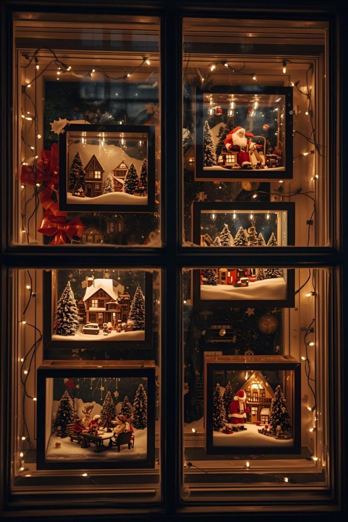 Shadow boxes let you bring small Christmas scenes right into your window space. Use small boxes or frames and fill them with mini ornaments, tiny lights, cotton snow, or miniature holiday figurines. Each box can tell a different Christmas story—Santa’s workshop, a nativity scene, or a snowy village.
