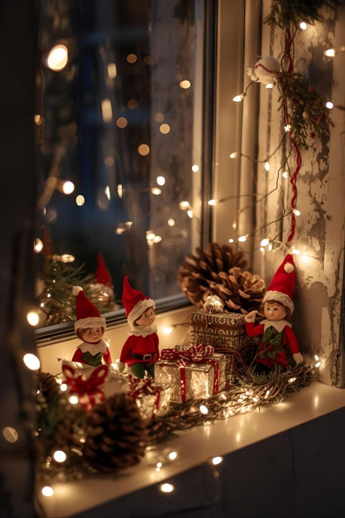Design a whimsical Christmas display with elves, mini presents, and fairy lights across the window sill.