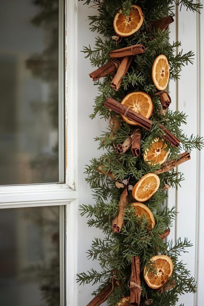 DIY garland made from cinnamon sticks, dried orange slices, and greenery for a vintage touch.