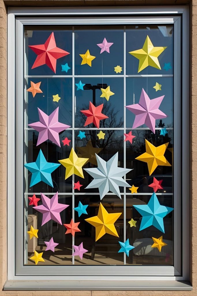 Schools can make a big impact with oversized paper stars in their windows. Cut stars from thick colored or metallic paper and arrange them in clusters or rows.