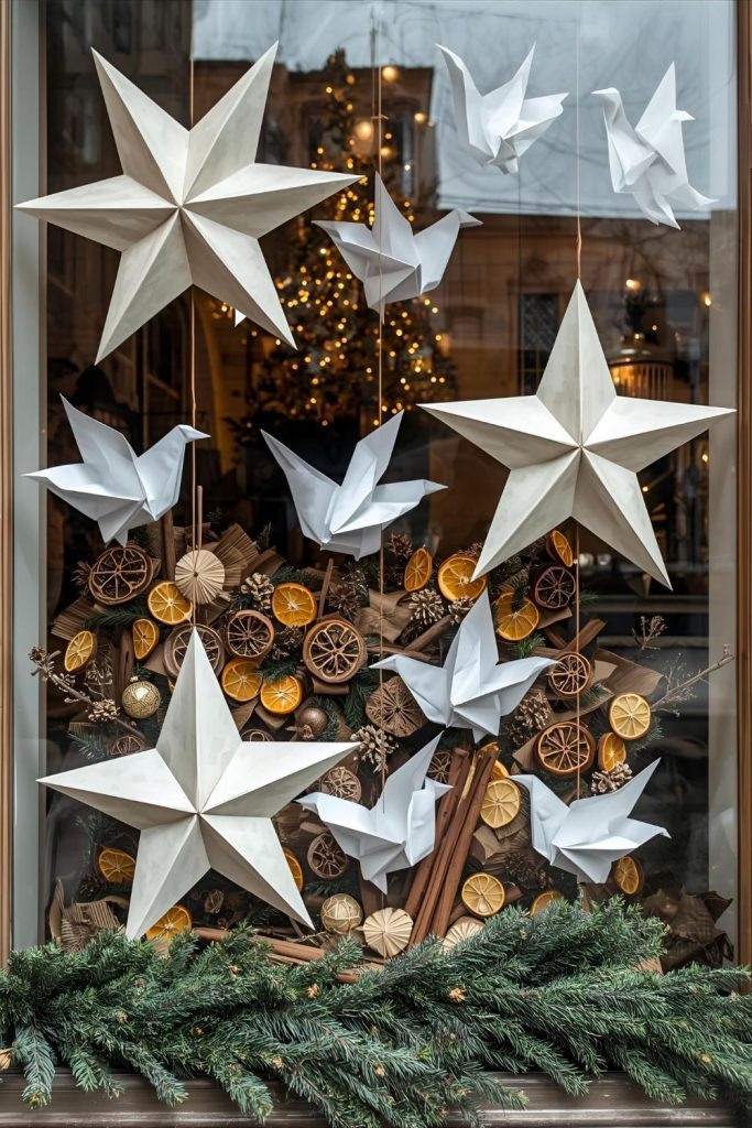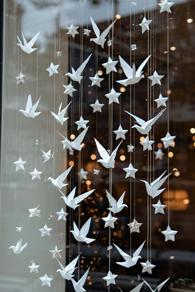 Origami doves and stars add a peaceful, elegant feel to Christmas windows. Fold paper into simple shapes, then hang them at varying heights using clear thread or thin ribbon.