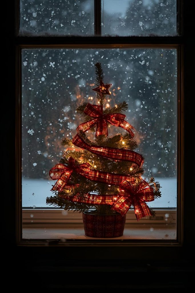 A small Christmas tree in your window is a classic but can be made unique with simple touches. Choose a tabletop or mini artificial tree and decorate with battery-powered fairy lights and wide ribbons.
