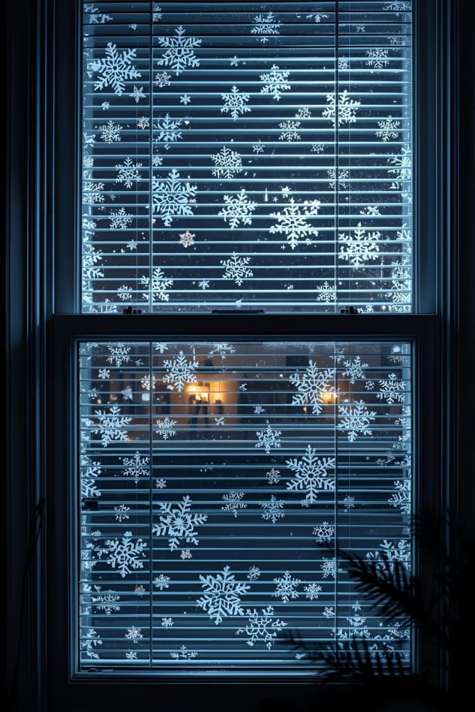 Add frosty snowflake window clings over blinds for a subtle yet sparkling decoration.