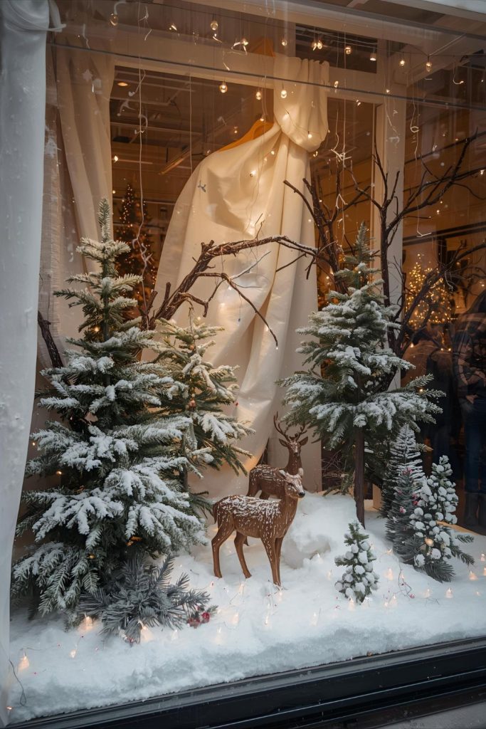 Retail shops can create a magical woodland scene with simple materials. Drape white fabric to mimic snow, scatter pine branches for greenery, and place deer or other woodland animal figurines along the sill.
