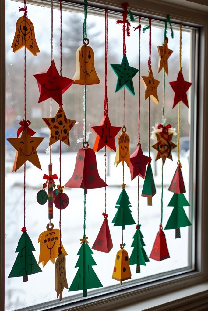 Daycares can brighten windows with simple construction paper ornaments. Kids can cut and decorate shapes like stars, bells, or trees, then hang them on yarn strings.